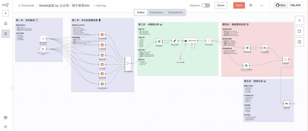 例如下图 Reddit平台的DJi舆情监控工作流,就是我用AI生成的: